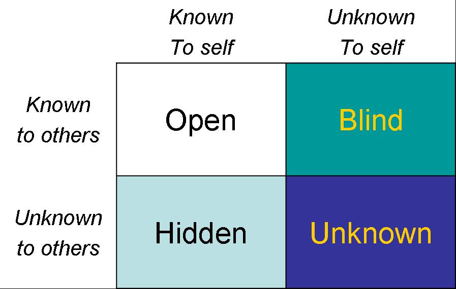 The Johari Window consists of four “panes,” each with a different level of visibility. The variables that define each pane, or quadrant, are awareness and who is aware.