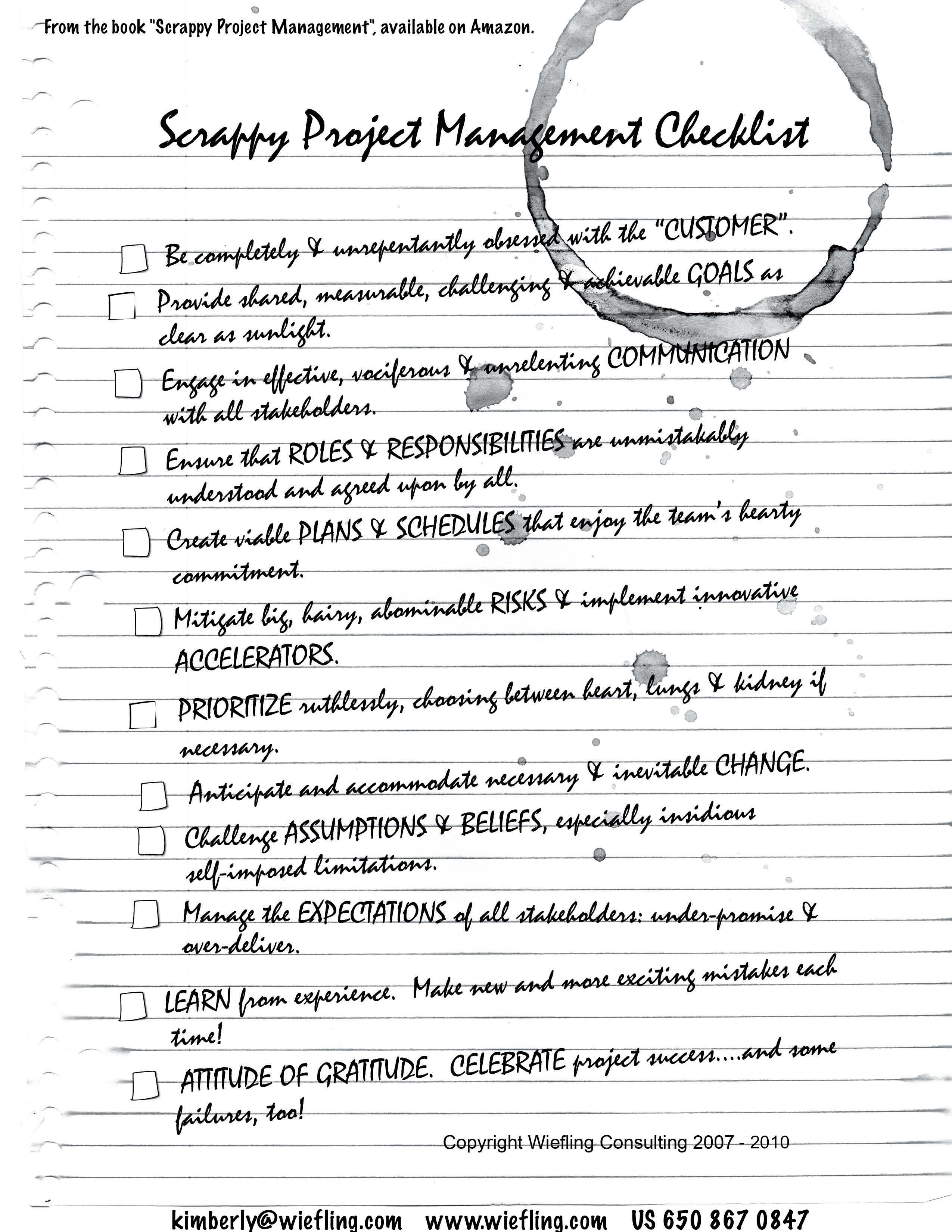 Now, you might think I’m just really smart, or really lucky, or just really bold in some way.  Not so.  My dad’s a welder, and I come from a middle class family, and I’m the only person to have completed college in our family.  I’m fortunate in many ways, but I can assure you that I’m a person of modest talent, but great discipline, especially when it comes to writing down my goals.  And I use my “Scrappy Project Management Checklist” (see image) to make sure I don’t forget to make common sense my common practice.