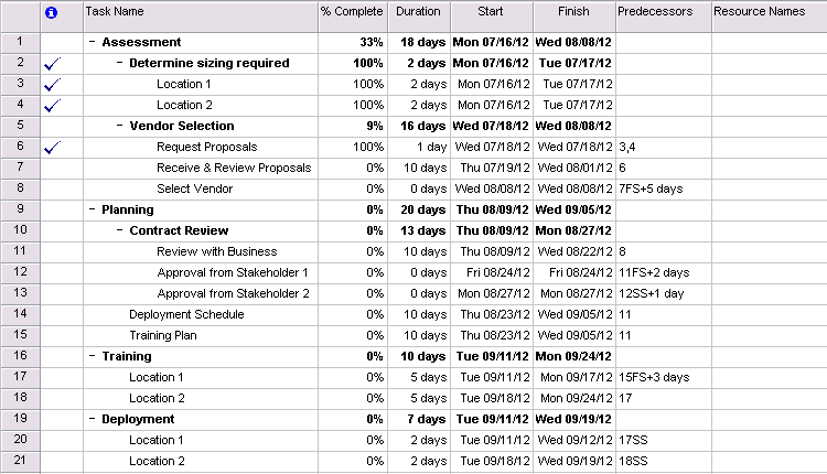 What we’ve been working on so far is the standard view in Microsoft Project. I add one more column to my simple project plans – “% Complete”. This helps to illustrate where you are on your project. Have you ever wondered how some of your colleagues could say things like “We are 33% complete in the Assessment Phase of our project!” This column is how it can be calculated.