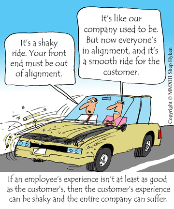 You want to aim for alignment in your company. Ever been in a car whose front end is out of alignment? It causes the entire car to shake. In business, if the employees don’t experience the same treatment, promise and value that you want for the customer, then the customer experience can be shaky and the entire company can suffer.