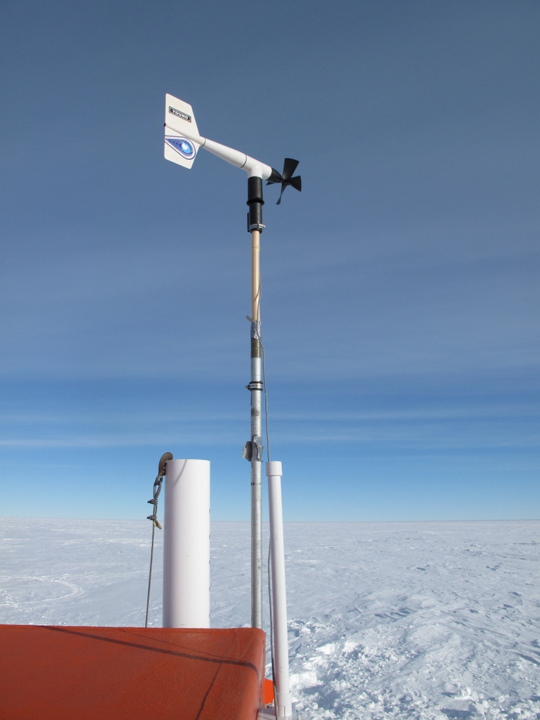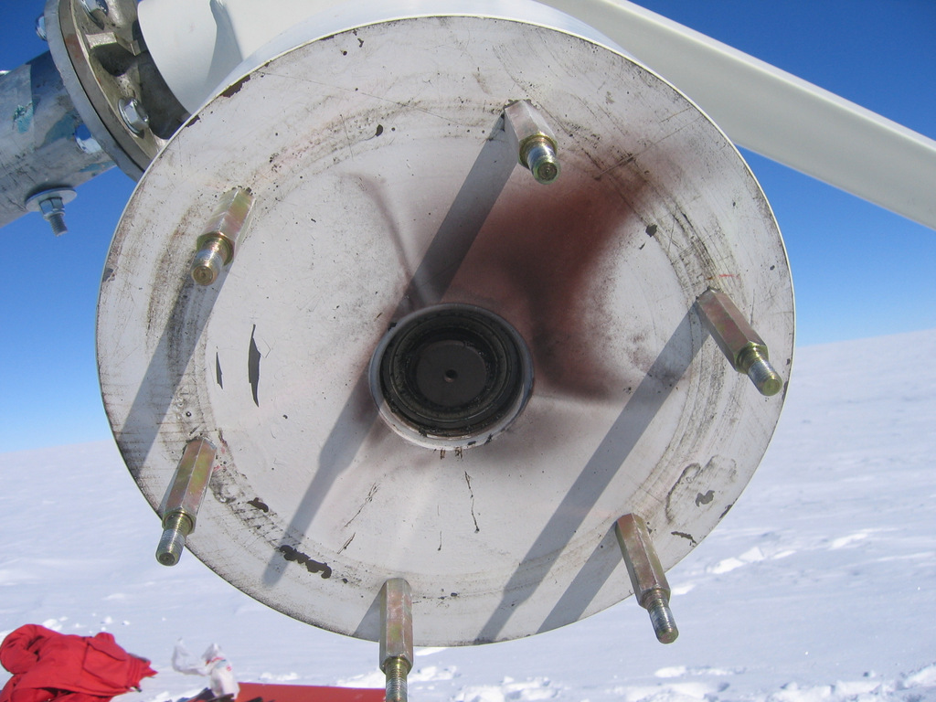 He observed this failure mode across the turbines at all the AGOs they visited that year. In addition, “they all had a tell-tale chocolate-pudding-looking schmutz around the upwind bearings,” which Andy recognized from other mechanical experience as a symptom of moisture getting mixed into the lubricant. The only source of moisture could be the constant, fine blow of ice crystals in the Polar air. (The original builders had apparently not anticipated that the very dry, high-altitude atmosphere could be a source of moisture, so had not tightly sealed the turbine bearings.) Not having appropriate parts or tools at hand to fabricate seals, and having limited time with a pilot standing by impatiently waiting to depart before bad weather set in, Andy cleaned out the bearing and lubricated it with whatever was at hand, “probably snowmobile oil,” and then created a bearing cap with foam packing material and duct tape. One year later, after 365 days of constant spinning, that particular turbine showed no further signs of degradation.