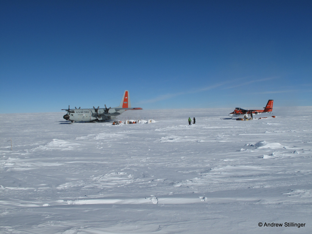 The travel itself requires at least 3 legs. After a commercial flight to Christchurch, New Zealand, Andy, Bob and any others on that year’s field team fly to McMurdo Station located by the Ross Ice Shelf on the coast of Antarctica. McMurdo is a permanent US research facility, the largest inhabited center in Antarctica, hosting about 1200 people year-round. From there, the field team and their cargo typically take the next available military cargo flight to South Pole Station, a much smaller permanently-staffed research facility at the geographic South Pole. At the height of the Antarctic summer there may be as many as 200 people residing there. The facility resembles a college dormitory including a cafeteria, lounges, weight room and basketball court. Hiking, running and even fat-tire biking are popular activities during the height of the season when the temperature reaches a toasty -5º or so. Unsurprisingly, many of the researchers who spend time at South Pole Station are outdoor- or adventure-sports enthusiasts.