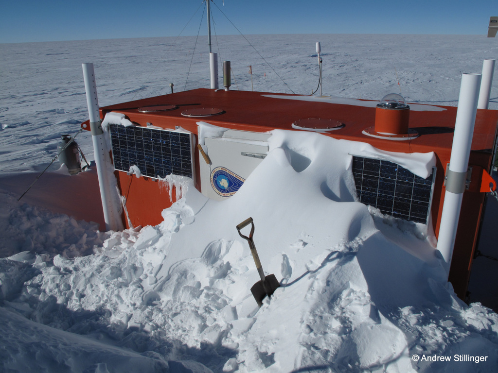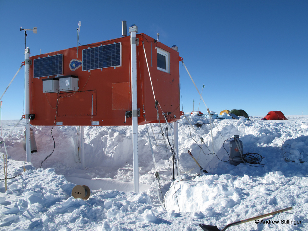 Each AGO sensing station consists of a bright orange physical shelter about the size and weight of an RV, containing computing, sensing, power and communications equipment. The shelter also contains a very small bunk and stove for melting water and heating food, to enable the field team to camp there briefly. (Visitors must set up a field latrine however, outside in a separate tent known as a “Scott Tent.”) The shelter stands on the snow on four white tubular metal legs with wooden feet. The legs are secured with metal guy cables. Outside the shelter is a wind turbine that supplies power during the 6-month dark season, or when the weather is cloudy, along with a variety of other sensing turbines, antennas, and so forth for data collection. Solar panels on an outside wall of the shelter provide power when the sun is shining.