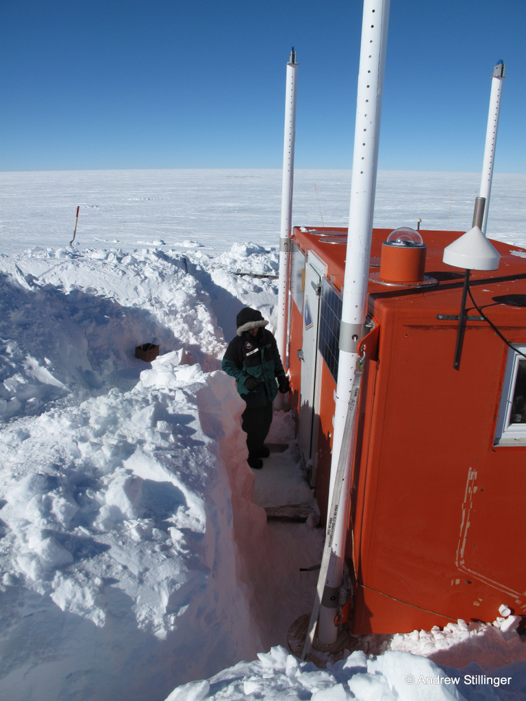 When the field team first arrives at an AGO, typically they find the shelter and outside equipment half-buried (or more) in snow. The biggest physical task, and the riskiest one that is in their control, is digging out and raising the shelter. The team shovels snow off the shelter and digs a trench around it. They then carefully winch up all four corners in a slow, multistep process to a total height of as much as 6 feet while the guy cables are repeatedly repositioned and re-tensioned The winching and guying activity is especially risky, for if a 5500-pound shelter 6 feet in the air were to tip over while someone is in the trench operating a winch, that person has no place to go. So taking measures to prevent the shelter from tipping and avoiding mistakes is critical – a fallen shelter poses a major risk not only to the project from the possibility of losing a shelter full of sensing equipment, but more importantly to life and limb thousands of miles from medical help.