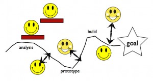 Not all stakeholders are created equal. Not everyone has to be involved. And you don’t want to have everyone messing around with your scope. So. Draw walls between your path and the stakeholders that don’t have or need an involvement. And when you draw, yell: “Block Them!” For those that need involvement draw a nice and inviting corridor (or arrow) between the flow and the stakeholder. I am still looking for a good phrase to say when you draw the arrow.