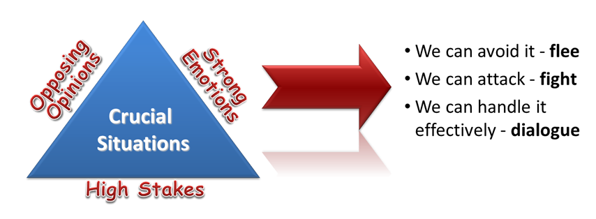 In situations that matter the most, we often perform at our worst. A basic question to ask is, “What is at stake here?” To avoid failure, the solution is to conduct a learning conversation which means to engage in dialogue with a free flow of meaning, as depicted in the picture by the flow from challenges to options.