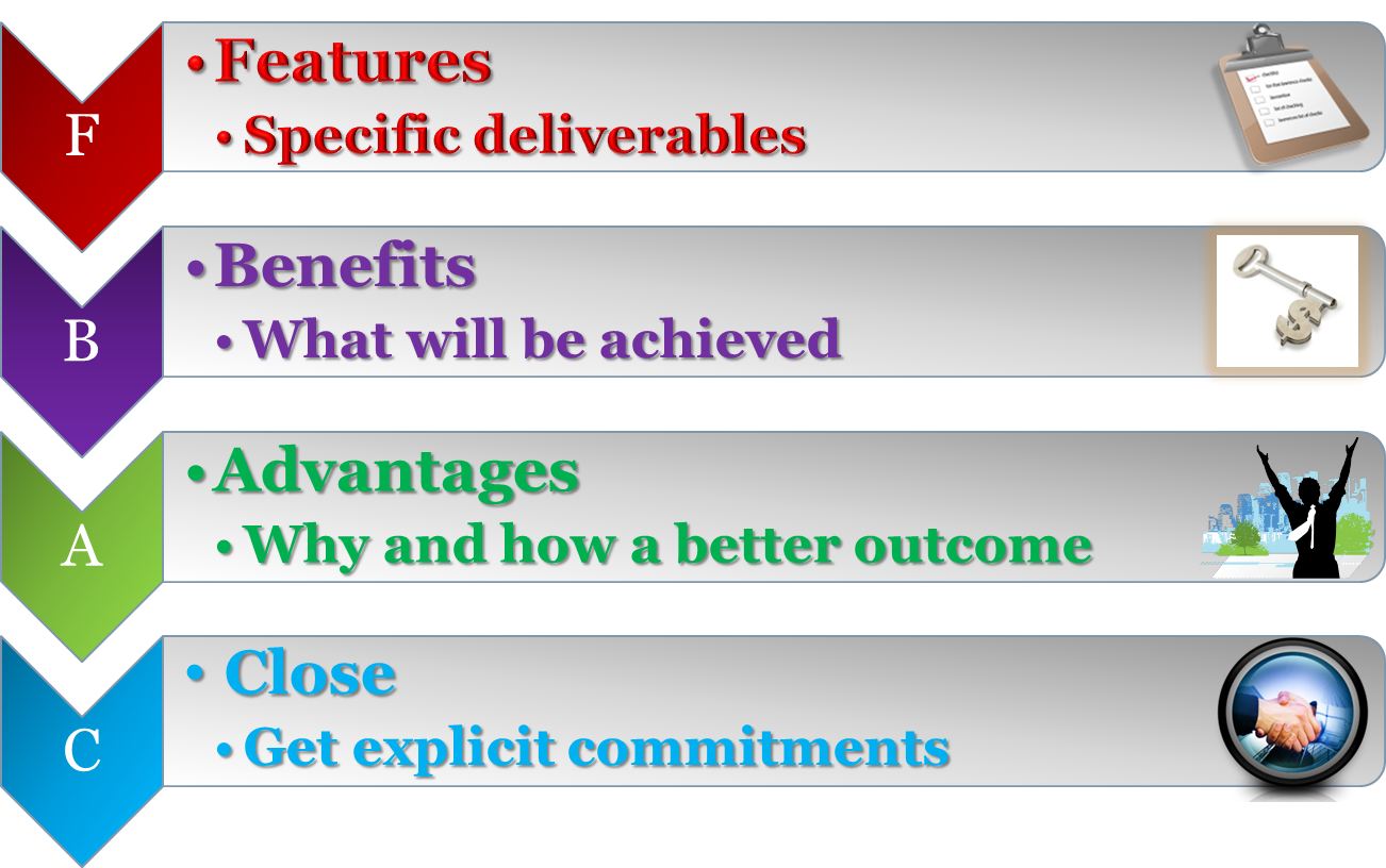 The classic sales approach, applicable to almost any environment, is to cover features, benefits, and advantages, as depicted in the picture. Seek compelling wording and arguments.