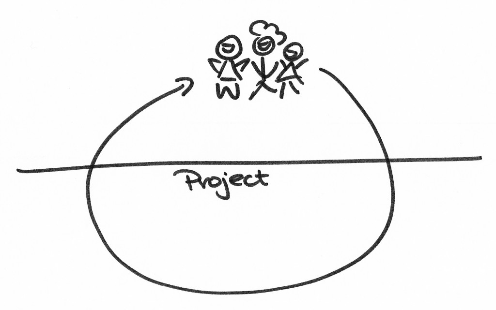 • The upper half of the circle represents time spent outside the project. Preparing for the voyage. And getting the results back to the place where it is needed.