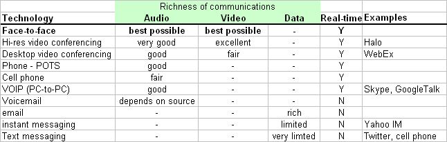This model shows the various classes of technologies in decreasing order of the richness of the connection between people. By “richness” I mean the relative amount of information conveyed in the form of auditory, visual, data, and body language cues.